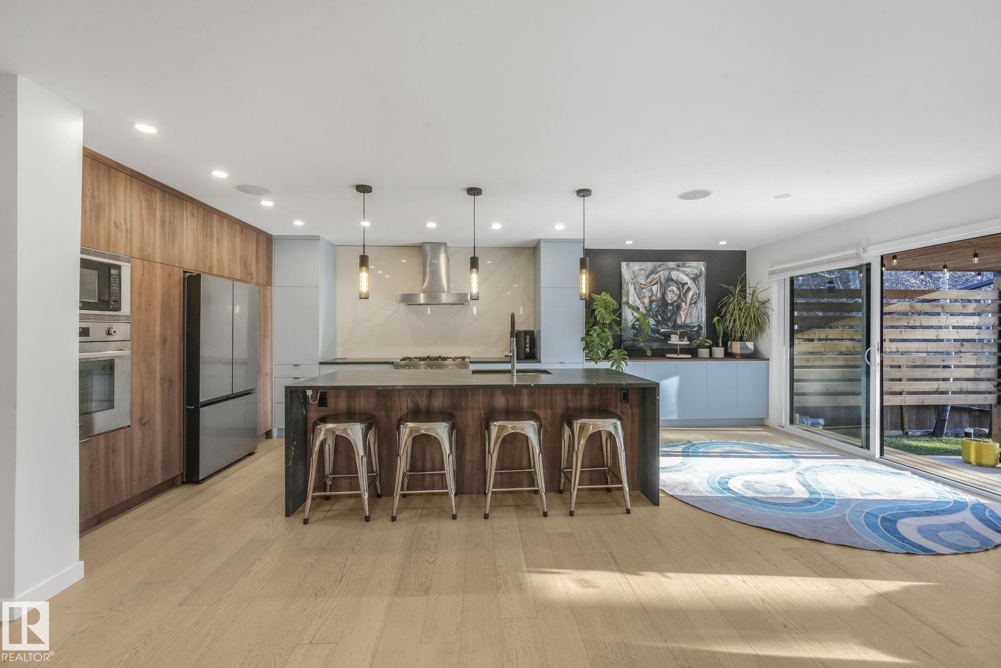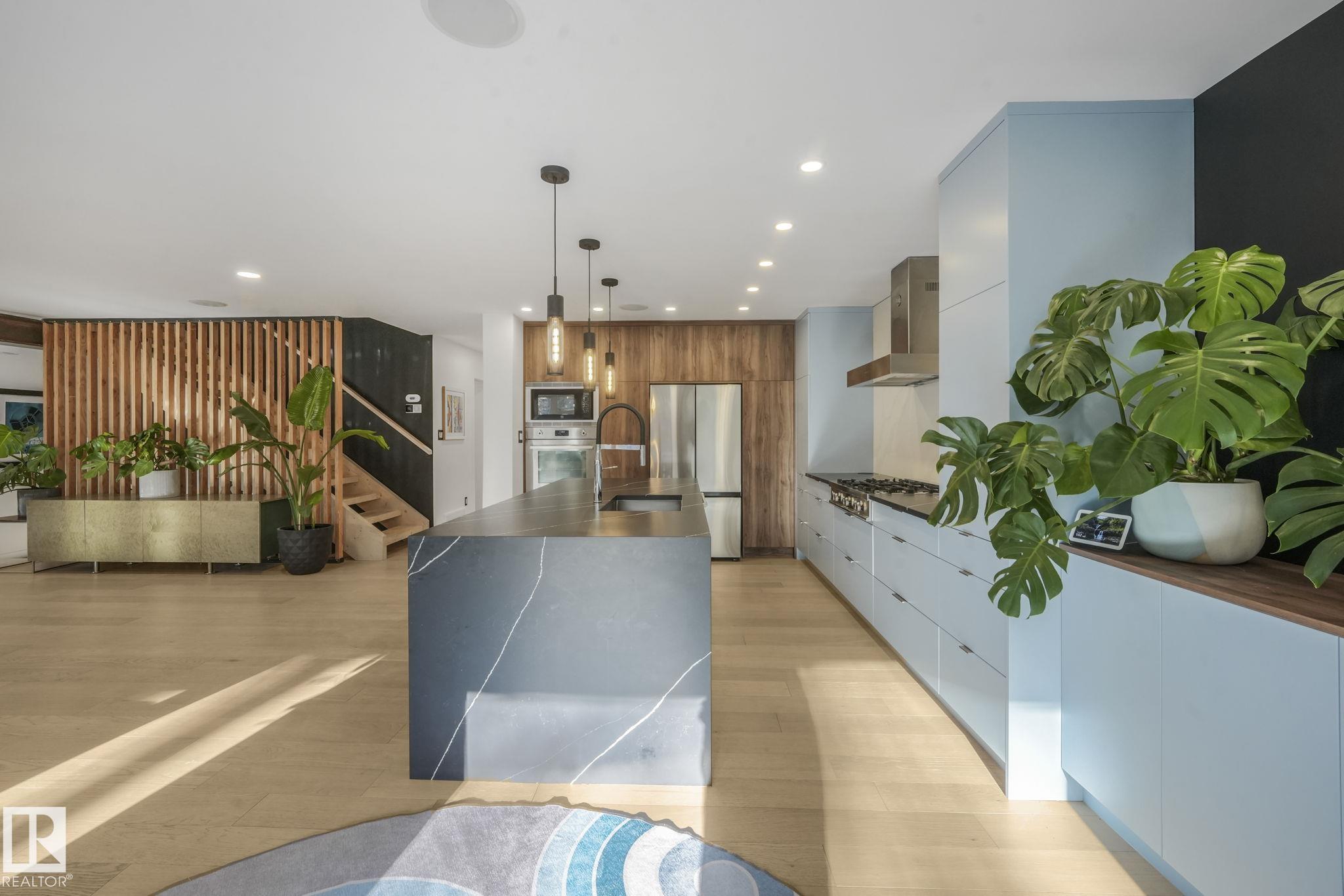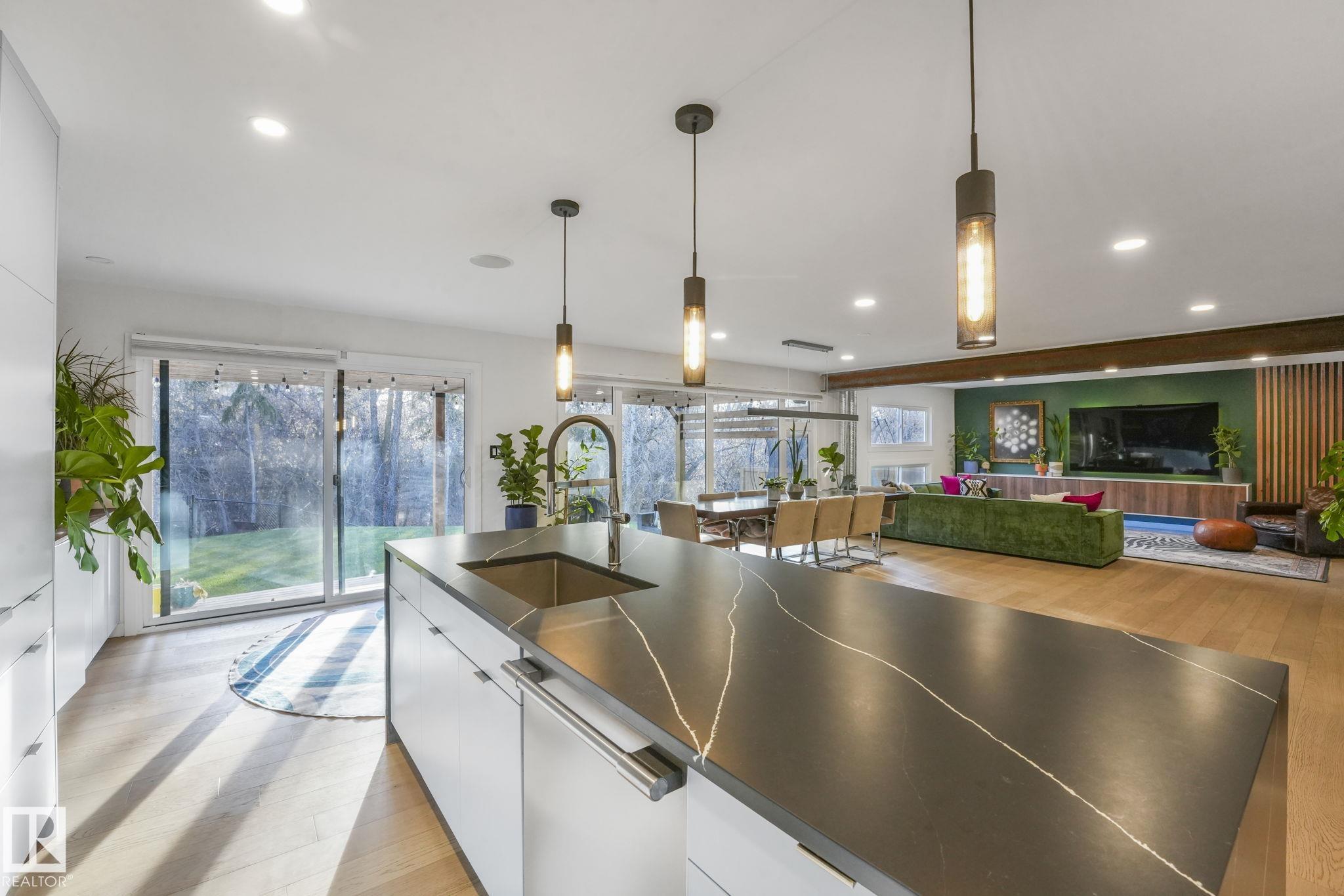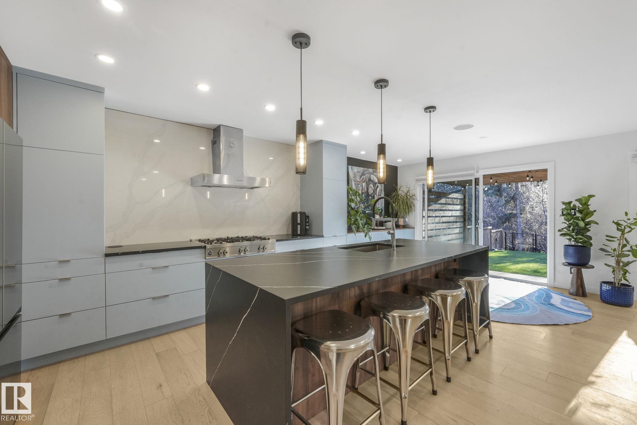 Beautiful South facing Ravine lot on MacKenzie Drive in central family friendly Crestwood, stunning one and a half story, Architecturally designed contemporary elegance with an open layout floor plan, fully professionally renovated modern dream home. The Kitchen and Dining area floor-to-ceiling windows flood the space with natural light, living room, all face the private south ravine, featured by a covered deck. The spectacular kitchen with a massive quartz island compliments the quartz countertops & backsp...