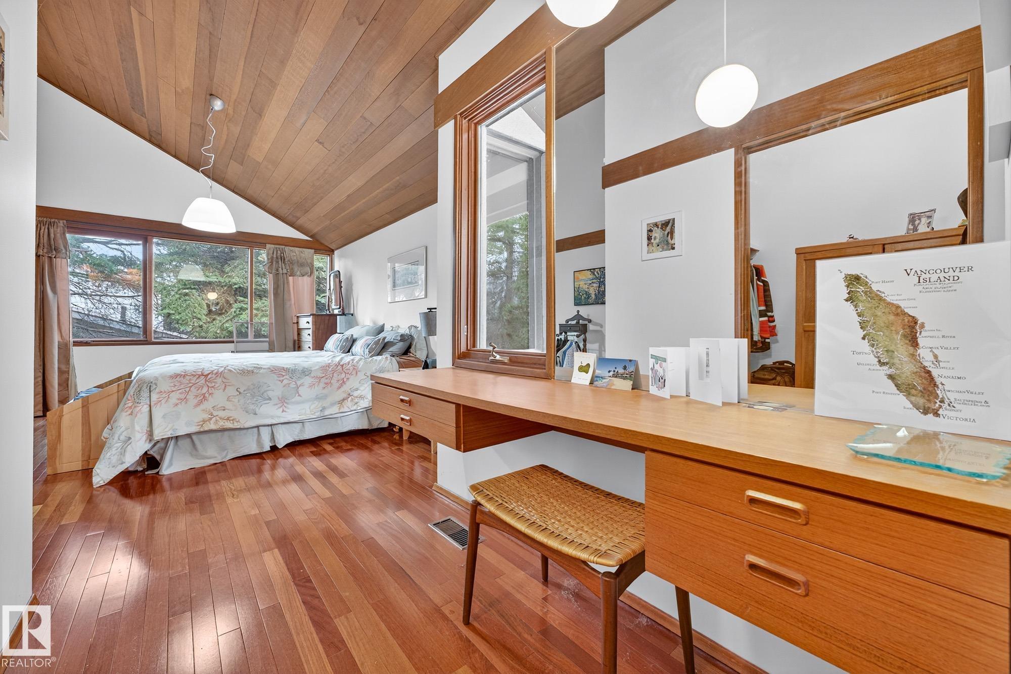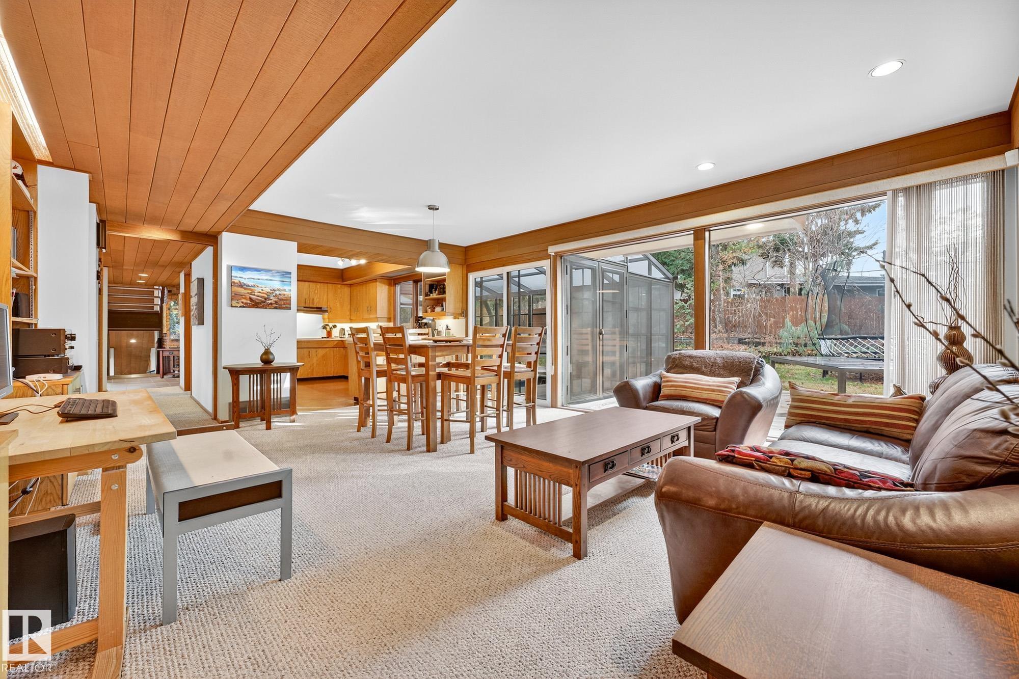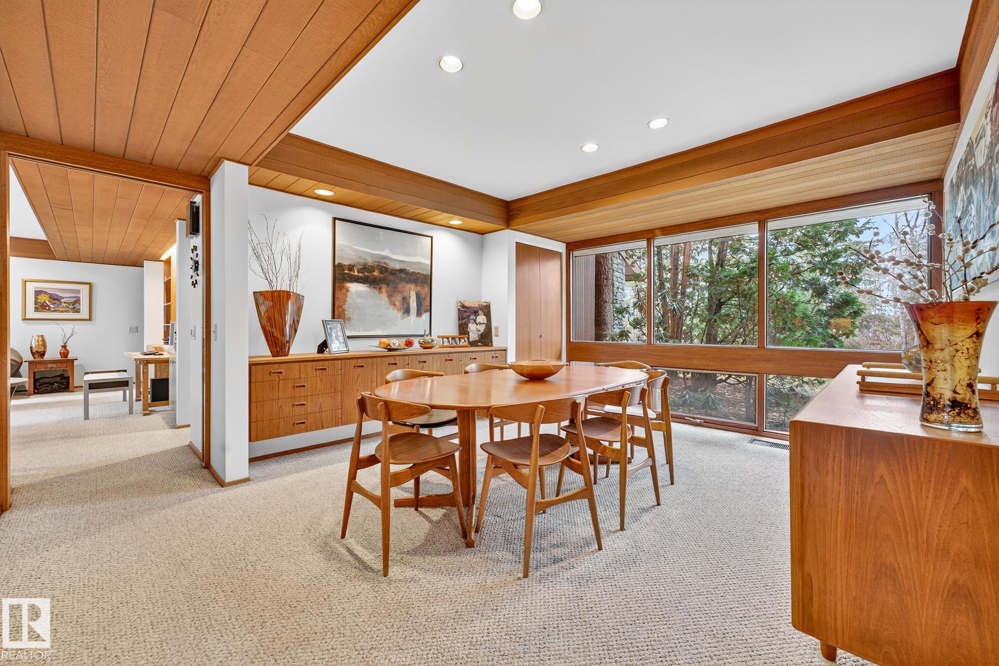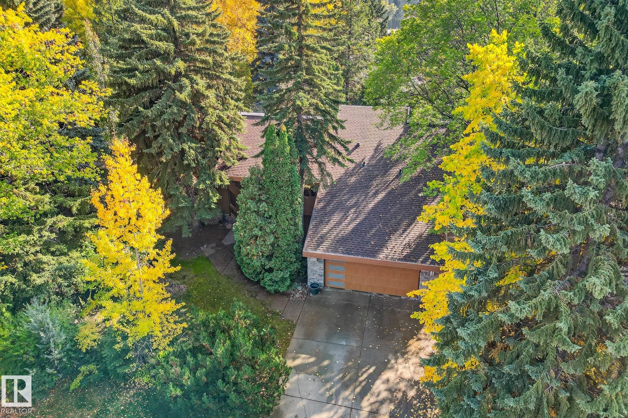 Rare opportunity to own a coveted Brander Drive home on a private ravine facing lot above Fort Edmonton Park. Set on a massive 90' x 120' treed property, this architect-designed 6 bedroom home offers nearly 4,000 sq. ft. of developed space with a warm mid-century modern feel. Floor-to-ceiling windows, rich wood accents, vaulted ceilings & feature brick fireplace create bright, inviting living spaces. Tasteful updates include a renovated main bath with steam shower & heated flooring, Brazilian cherry hardwoo...