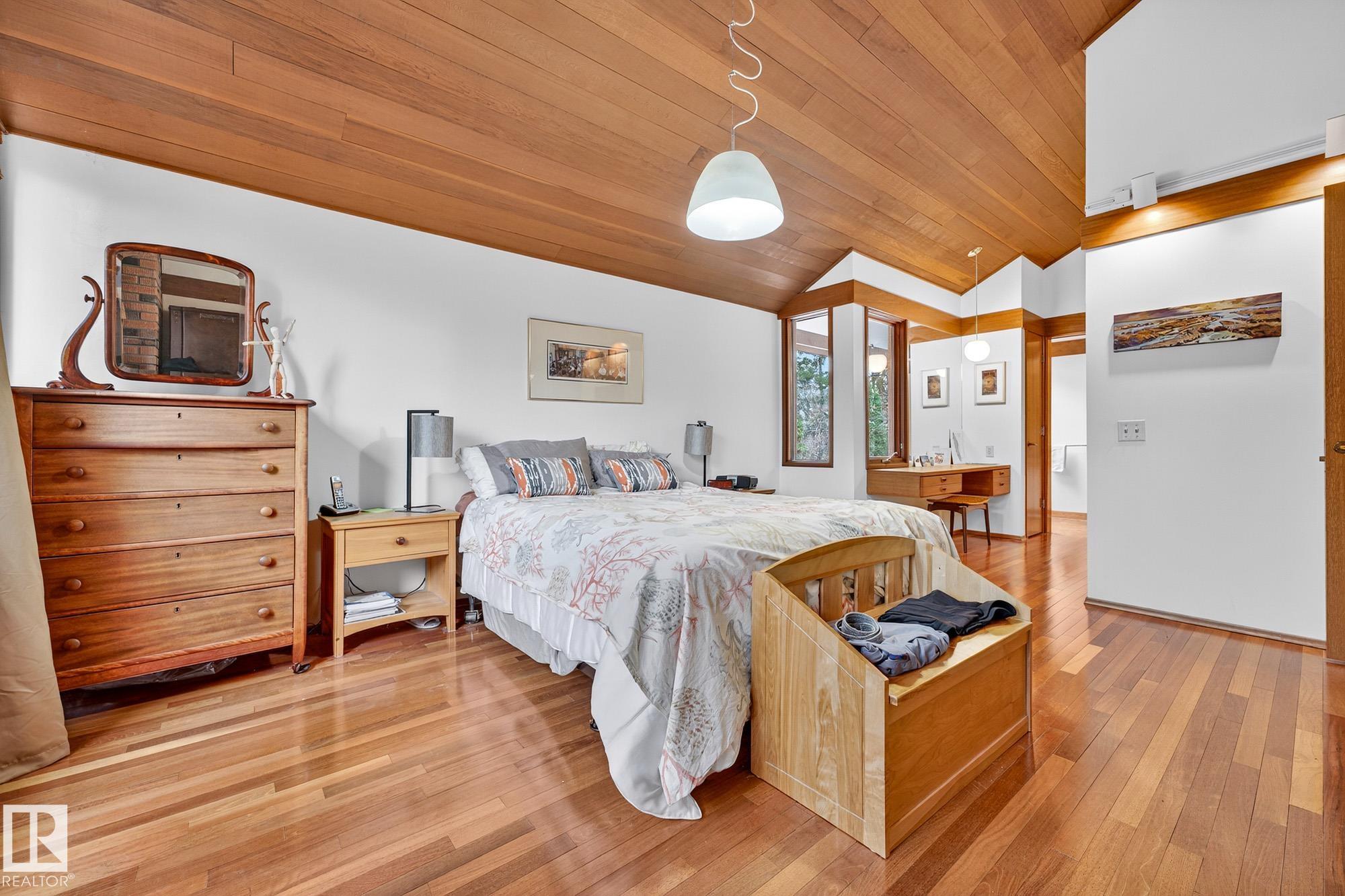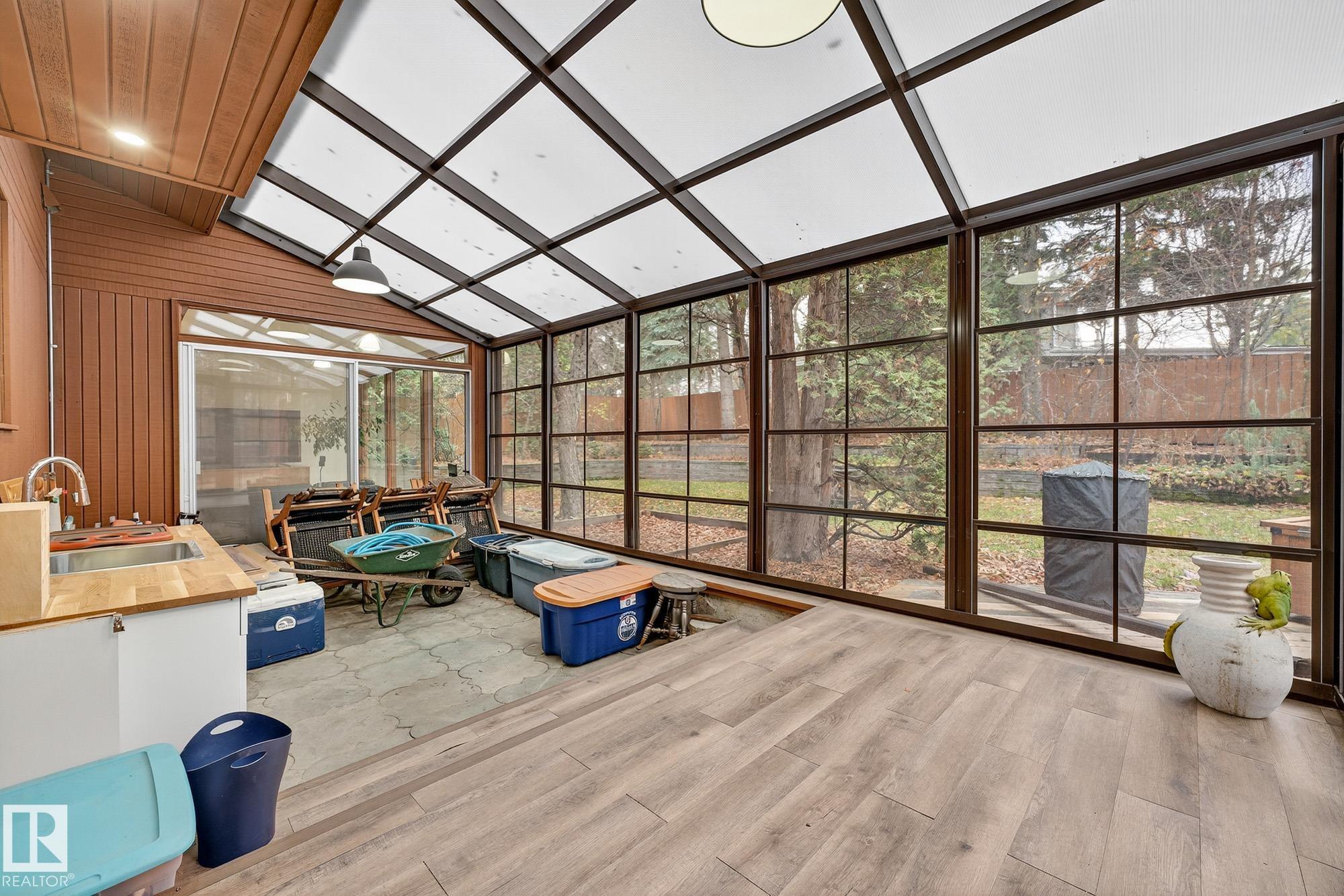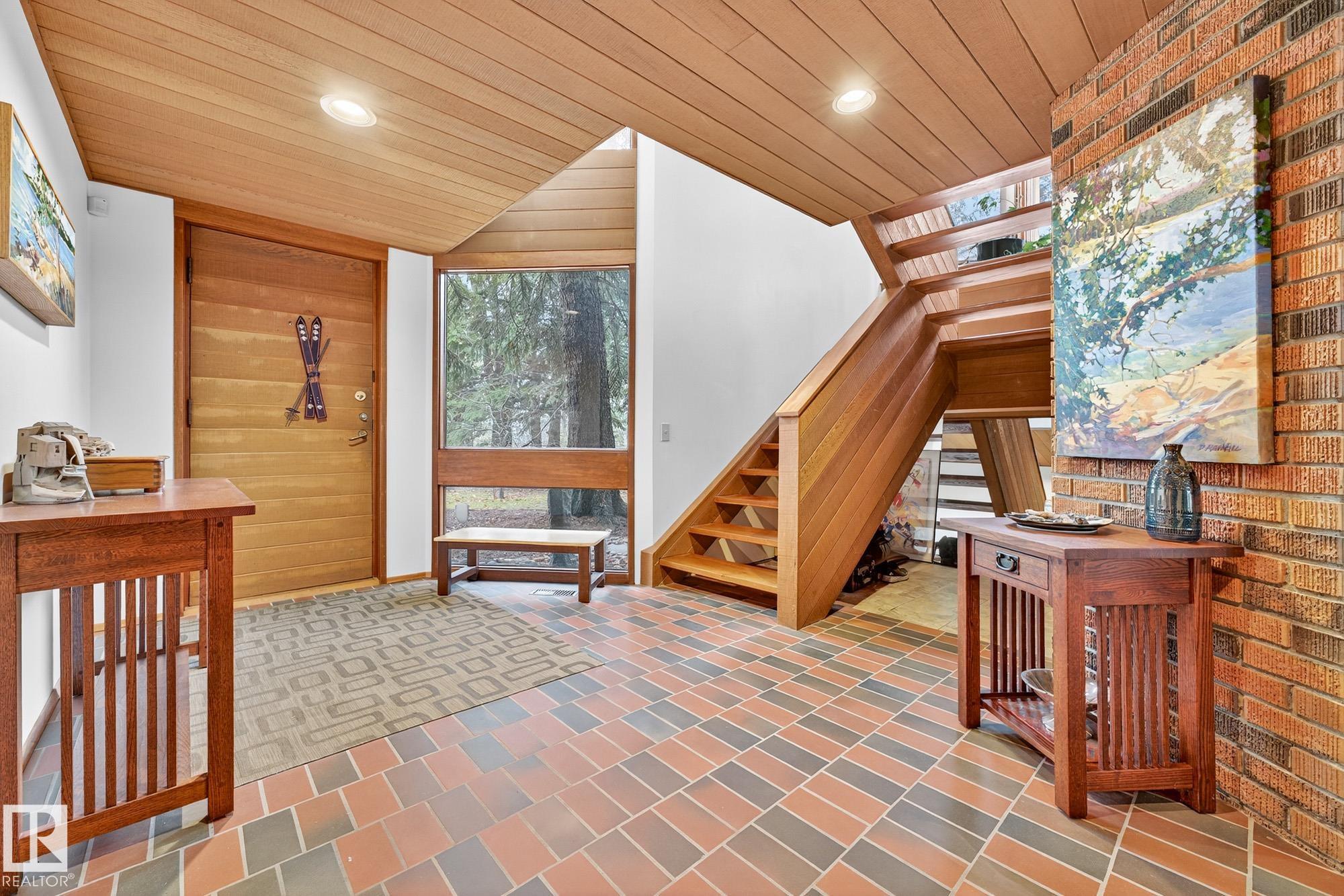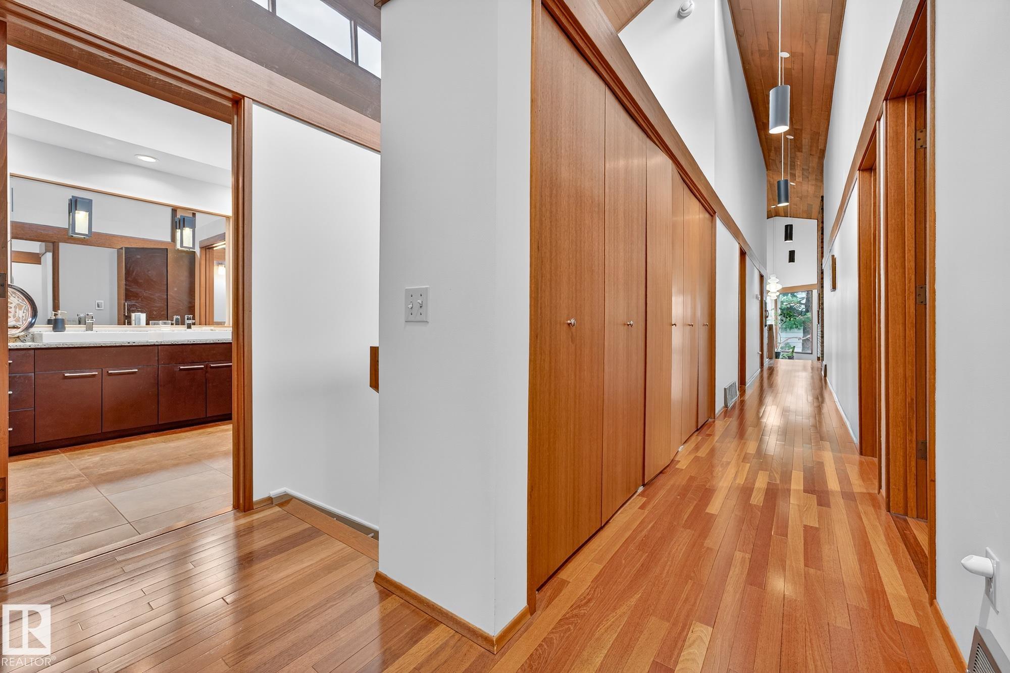 Rare opportunity to own a coveted Brander Drive home on a private ravine facing lot above Fort Edmonton Park. Set on a massive 90' x 120' treed property, this architect-designed 6 bedroom home offers nearly 4,000 sq. ft. of developed space with a warm mid-century modern feel. Floor-to-ceiling windows, rich wood accents, vaulted ceilings & feature brick fireplace create bright, inviting living spaces. Tasteful updates include a renovated main bath with steam shower & heated flooring, Brazilian cherry hardwoo...